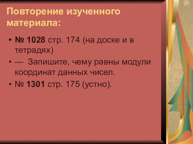 Повторение изученного материала:№ 1028 стр. 174 (на доске и в тетрадях)— Запишите, чему равны модули координат данных