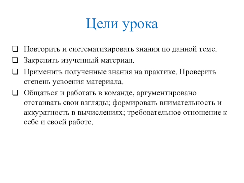 Общаться и работать в команде, аргументировано отстаивать свои взгляды; формировать внимательность и аккуратность в вычислениях; требовательное отношение к себе и своей работе.