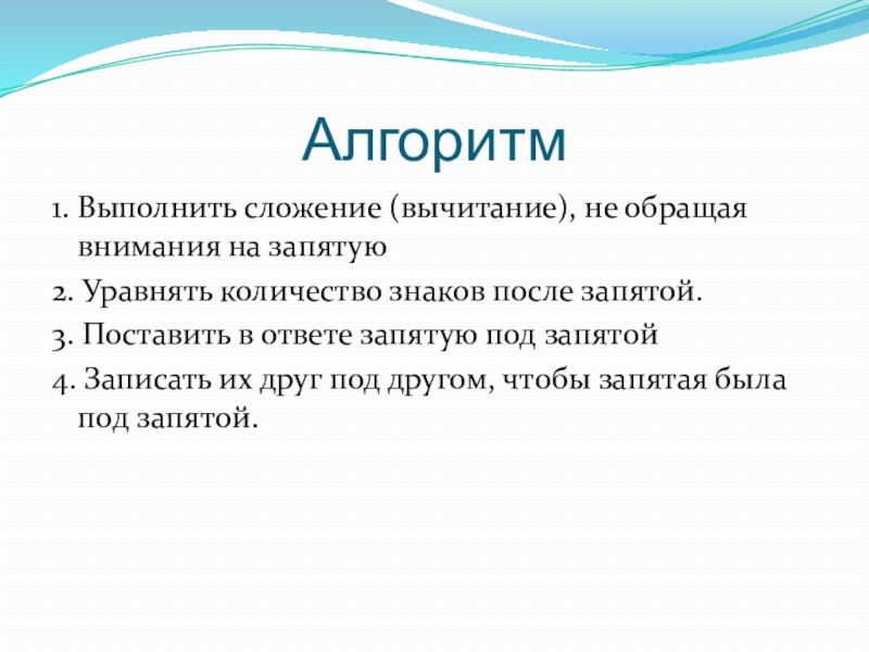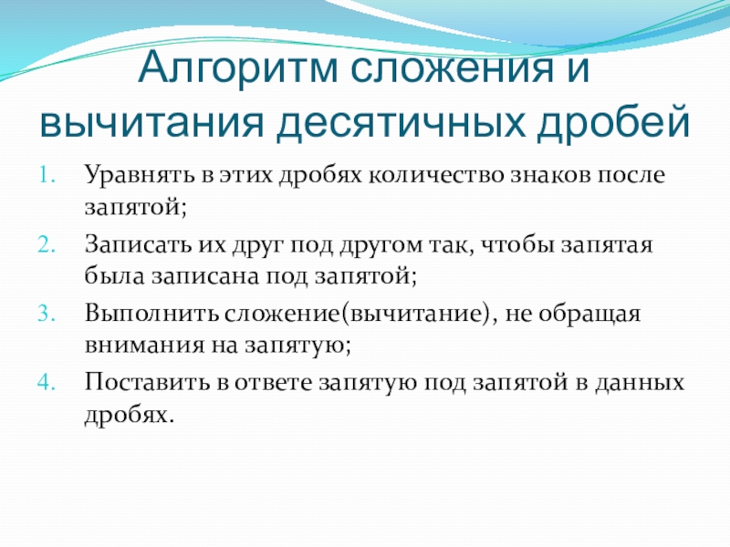 Слайд 6Алгоритм сложения и вычитания десятичных дробей