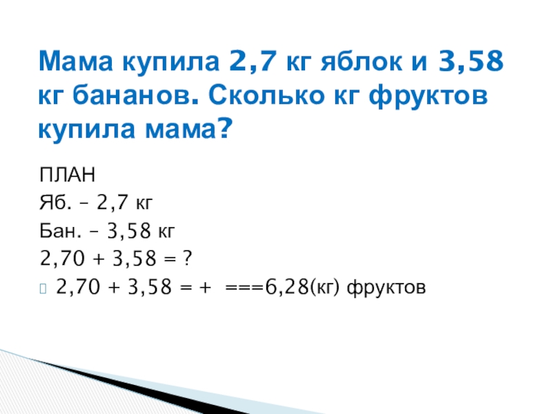 Мама купила 2,7 кг яблок и 3,58 кг бананов. Сколько кг фруктов купила мама?