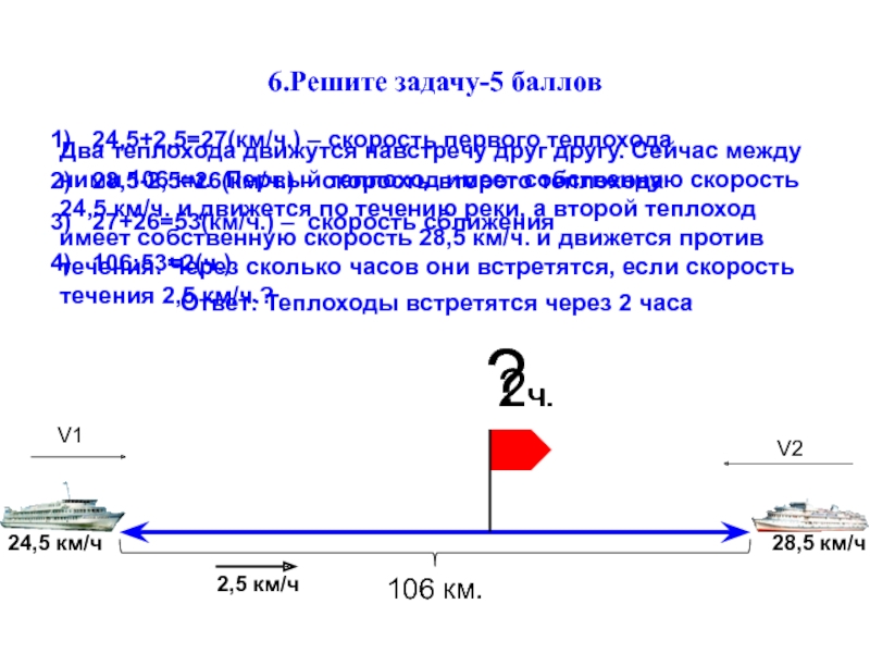 28,5-2,5=26(км/ч.) – скорость второго теплохода