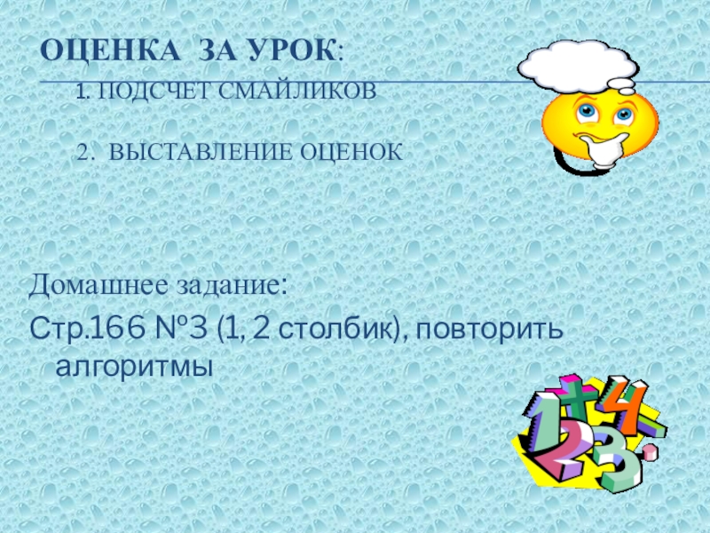 Стр.166 №3 (1, 2 столбик), повторить алгоритмы