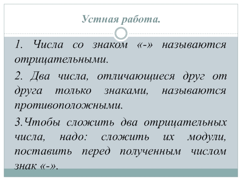 3.Чтобы сложить два отрицательных числа, надо: сложить их модули, поставить перед полученным числом знак «-».