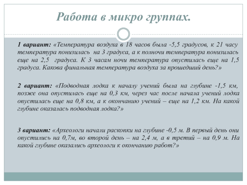 3 вариант: «Археологи начали раскопки на глубине -0,5 м. В первый день они опустились на 0,7м, во второй день – на 2,4 м, а в третий – на 0,9 м. На какой глубине оказались археологи к окончанию работ?»