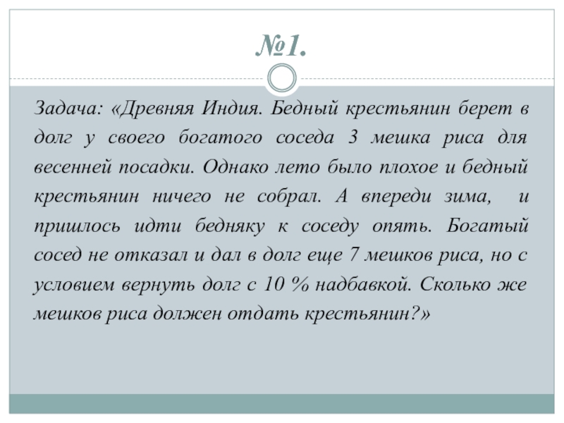 Задача: «Древняя Индия. Бедный крестьянин берет в долг у своего богатого