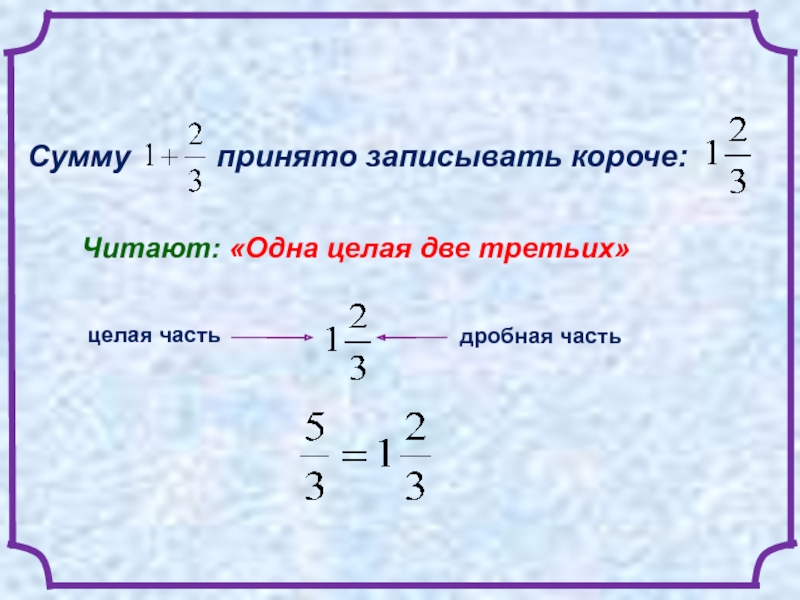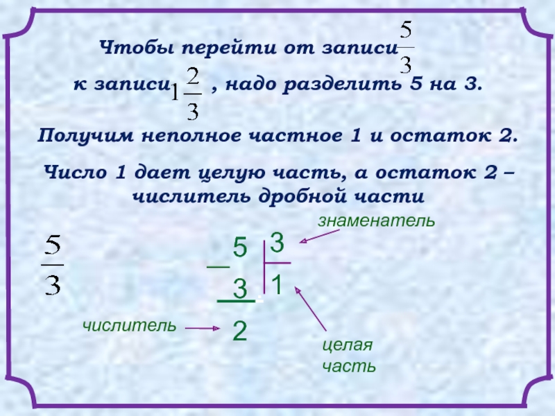 Число 1 дает целую часть, а остаток 2 – числитель дробной части