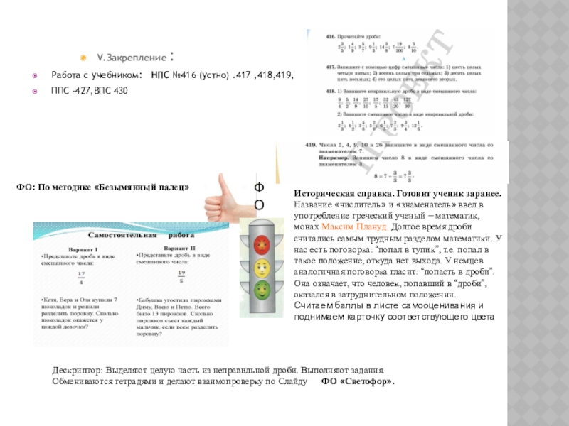 Историческая справка. Готовит ученик заранее. Название «числитель» и «знаменатель» ввел в употребление греческий ученый – математик, монах Максим Плануд. Долгое время дроби считались самым трудным разделом математики. У нас есть поговорка: “попал в тупик”, т.е. попал в такое положение, откуда нет выхода. У немцев аналогичная поговорка гласит: “попасть в дроби”. Она означает, что человек, попавший в “дроби”, оказался в затруднительном положении.