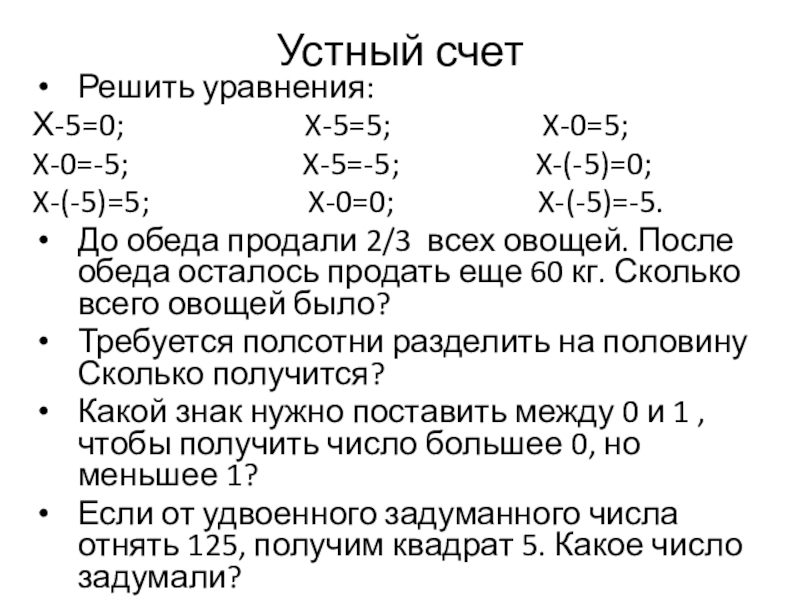 Устный счетРешить уравнения:Х-5=0; X-5=5; X-0=5; X-0=-5;