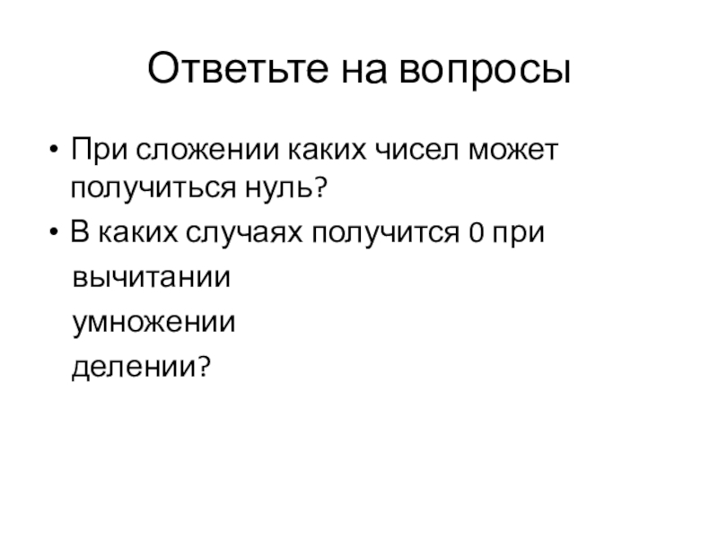 Ответьте на вопросыПри сложении каких чисел может получиться нуль?В каких случаях получится 0 при  вычитании