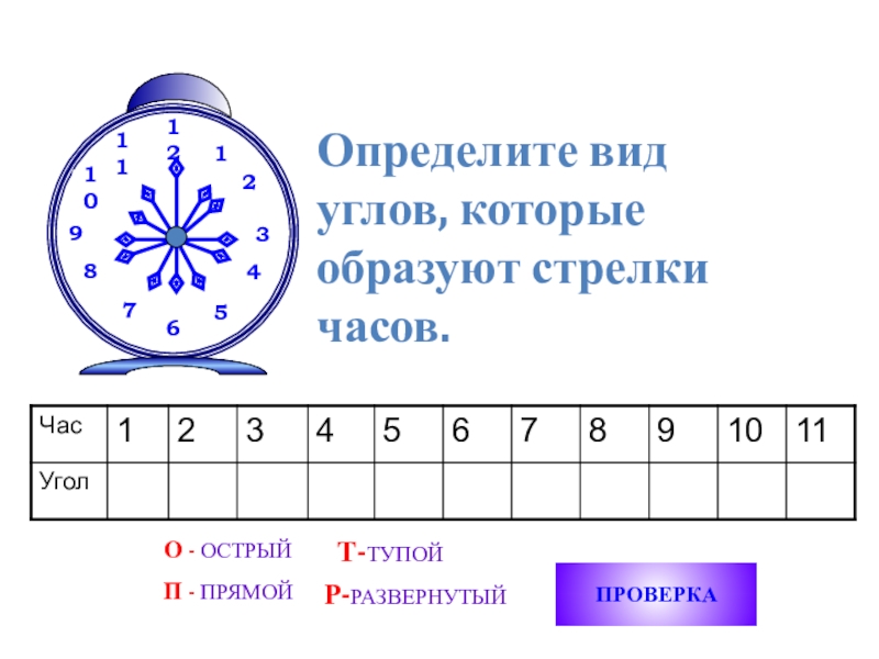 Определите вид углов, которые образуют стрелки часов.ПРОВЕРКАО - ОСТРЫЙП - ПРЯМОЙТ-ТУПОЙР-РАЗВЕРНУТЫЙ