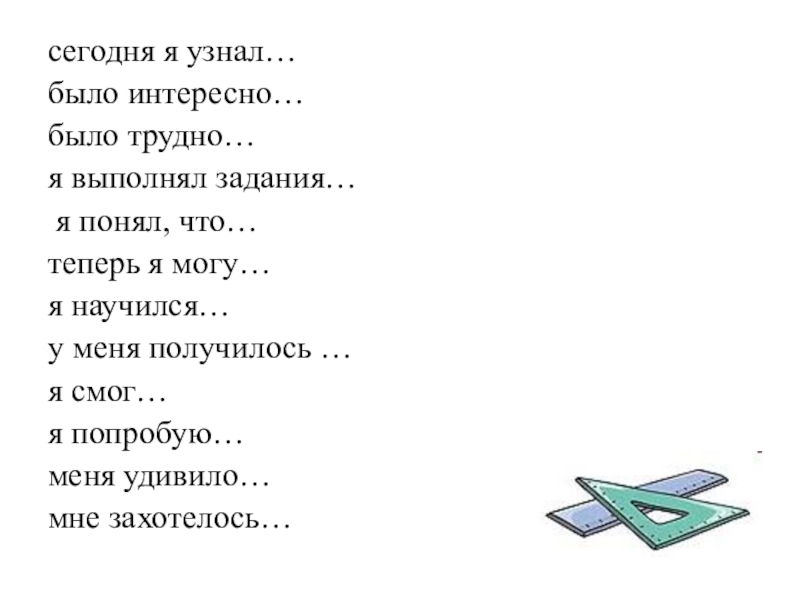 сегодня я узнал…было интересно…было трудно…я выполнял задания… я понял, что…теперь я могу…я научился…у меня получилось …я смог…я