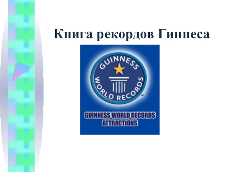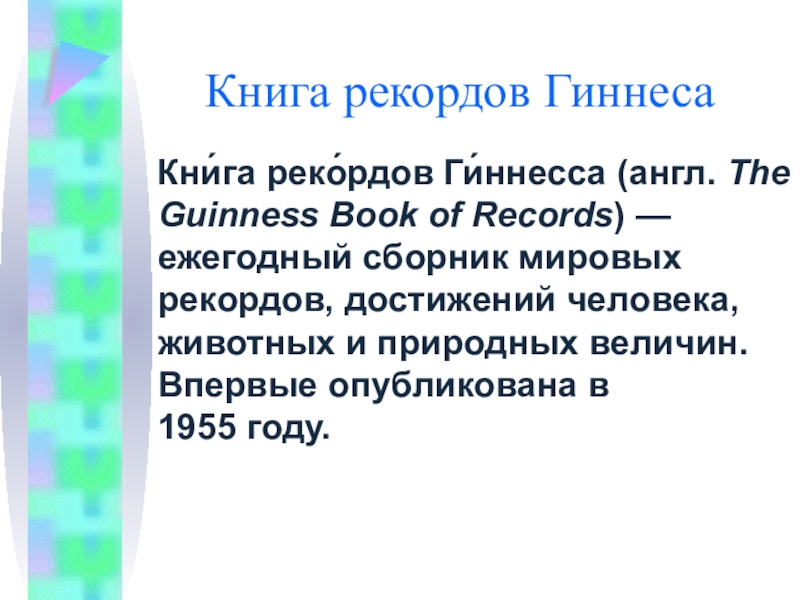 Книга рекордов Гиннеса  Кни́га реко́рдов Ги́ннесса (англ. The Guinness Book of Records) — ежегодный сборник мировых рекордов, достижений
