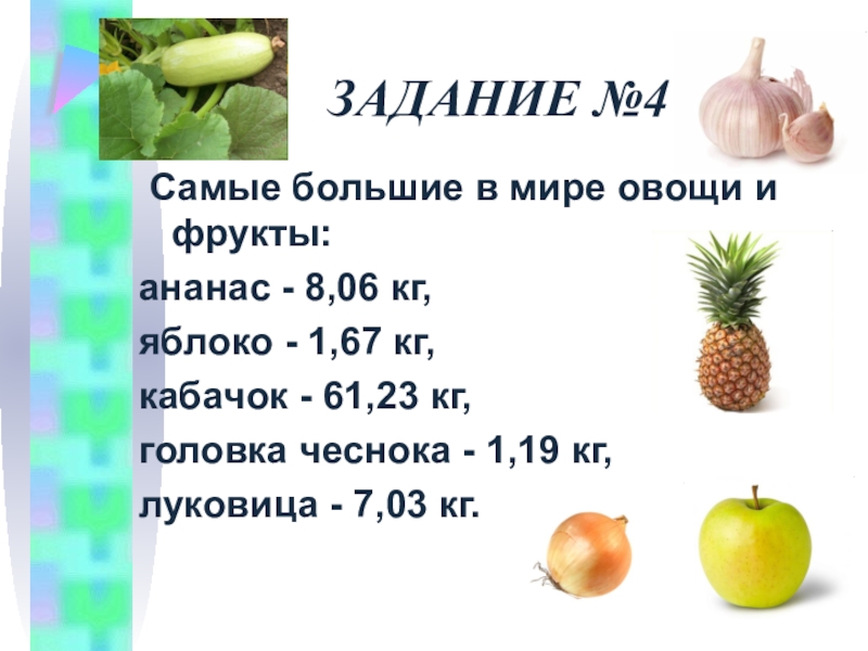ЗАДАНИЕ №4 Самые большие в мире овощи и фрукты: ананас - 8,06 кг,яблоко - 1,67 кг,кабачок -