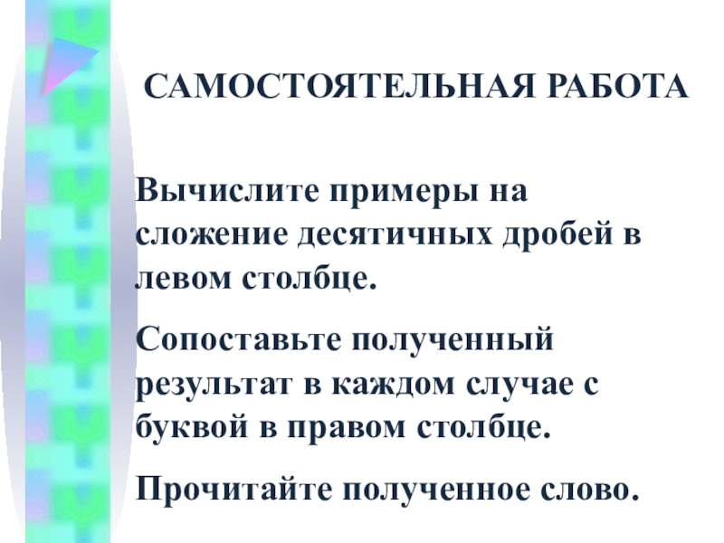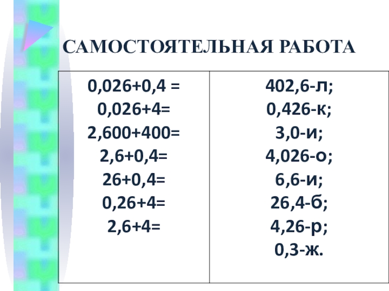 САМОСТОЯТЕЛЬНАЯ РАБОТА Вычислите примеры на сложение десятичных дробей в левом столбце. Сопоставьте полученный результат в каждом случае