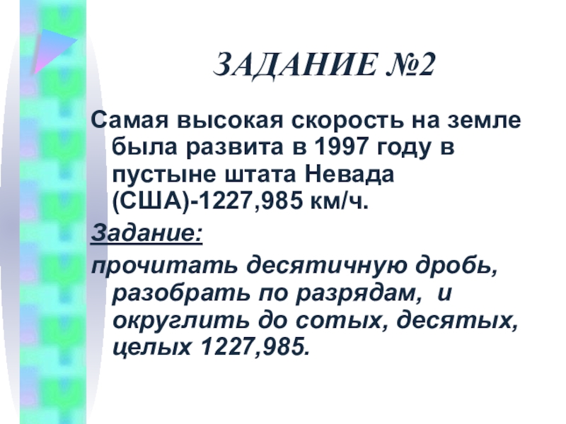 ЗАДАНИЕ №2Самая высокая скорость на земле была развита в 1997 году в пустыне штата Невада (США)-1227,985 км/ч.Задание: