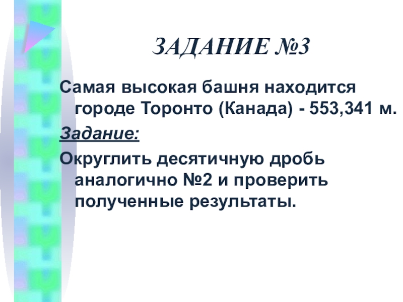ЗАДАНИЕ №3Самая высокая башня находится городе Торонто (Канада) - 553,341 м.Задание: Округлить десятичную дробь аналогично №2 и
