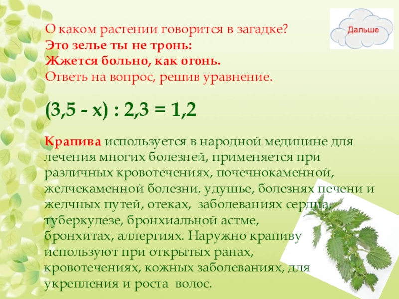 Крапива используется в народной медицине для лечения многих болезней, применяется при различных кровотечениях, почечнокаменной, желчекаменной болезни, удушье, болезнях печени и желчных путей, отеках, заболеваниях сердца, туберкулезе, бронхиальной астме, бронхитах, аллергиях. Наружно крапиву используют при открытых ранах, кровотечениях, кожных заболеваниях, для укрепления и роста волос.