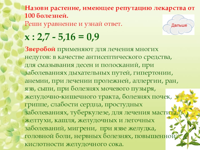 Зверобой применяют для лечения многих недугов: в качестве антисептического средства, для смазывания десен и полосканий, при заболеваниях дыхательных путей, гипертонии, анемии, при лечении пролежней, аллергии, ран, язв, сыпи, при болезнях мочевого пузыря, желудочно-кишечного тракта, болезнях почек, гриппе, слабости сердца, простудных заболеваниях, туберкулезе, для лечения мастита, желтухи, кашля, желудочных и легочных заболеваний, мигрени, при язве желудка, головной боли, нервных болезнях, повышенной кислотности желудочного сока.