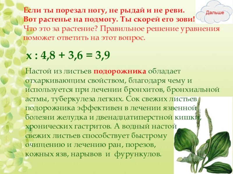 Настой из листьев подорожника обладает отхаркивающим свойством, благодаря чему и используется при лечении бронхитов, бронхиальной астмы, туберкулеза легких. Сок свежих листьев подорожника эффективен в лечении язвенной болезни желудка и двенадцатиперстной кишки, хронических гастритов. А водный настой свежих листьев способствует быстрому очищению и лечению ран, порезов, кожных язв, нарывов и фурункулов.