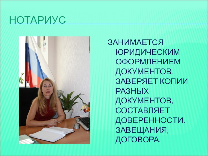ЗАНИМАЕТСЯ ЮРИДИЧЕСКИМ ОФОРМЛЕНИЕМ ДОКУМЕНТОВ. ЗАВЕРЯЕТ КОПИИ РАЗНЫХ ДОКУМЕНТОВ, СОСТАВЛЯЕТ ДОВЕРЕННОСТИ, ЗАВЕЩАНИЯ,