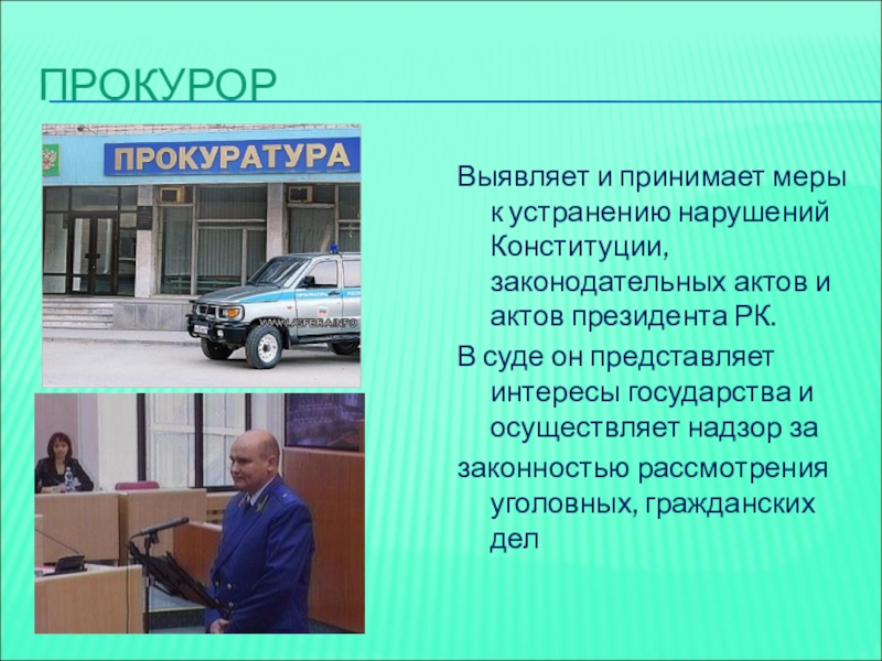 Выявляет и принимает меры к устранению нарушений Конституции, законодательных актов и