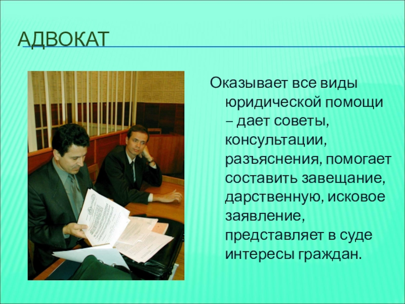 составить завещание, дарственную, исковое заявление, представляет в суде интересы граждан.