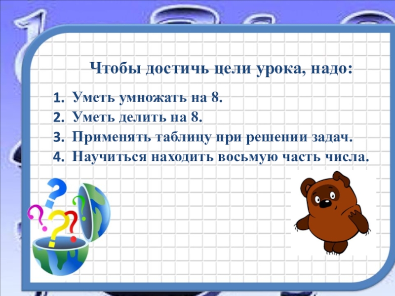 научиться находить восьмую часть числа.