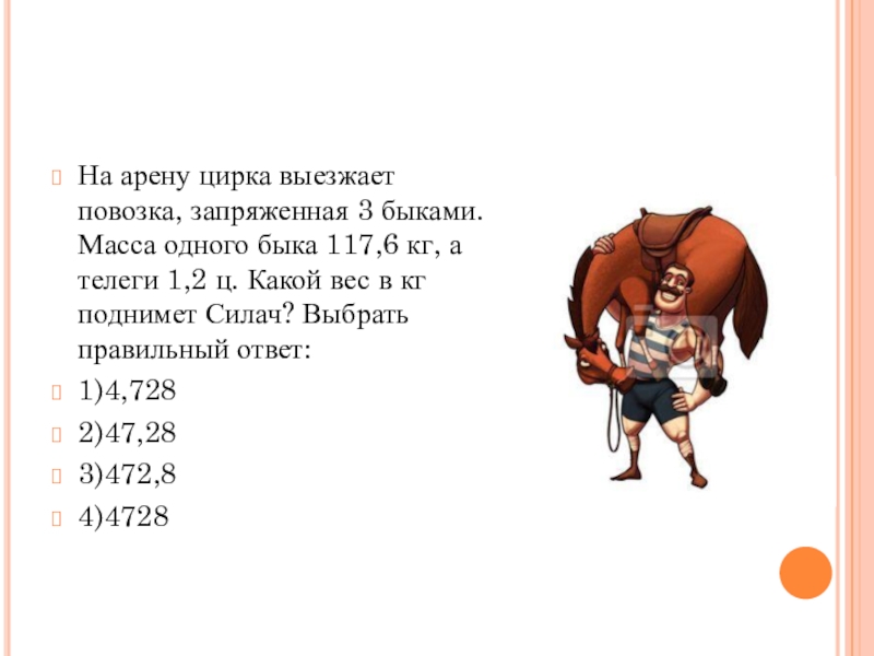 117,6 кг, а телеги 1,2 ц. Какой вес в кг поднимет Силач? Выбрать правильный ответ: