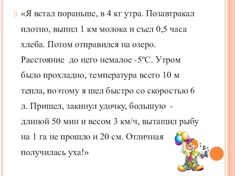 км молока и съел 0,5 часа хлеба. Потом отправился на озеро. Расстояние до него немалое -5ºС. Утром было прохладно, температура всего 10 м тепла, поэтому я шел быстро со скоростью 6 л. Пришел, закинул удочку, большую - длиной 50 мин и весом 3 км/ч, вытащил рыбу на 1 га не прошло и 20 см. Отличная получилась уха!»
