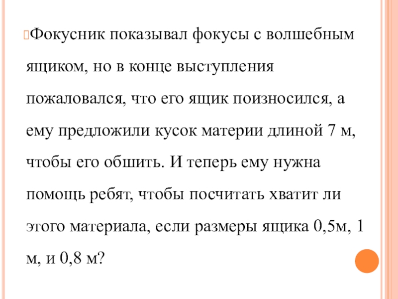 что его ящик поизносился, а ему предложили кусок материи длиной 7 м, чтобы его обшить. И теперь ему нужна помощь ребят, чтобы посчитать хватит ли этого материала, если размеры ящика 0,5м, 1 м, и 0,8 м?