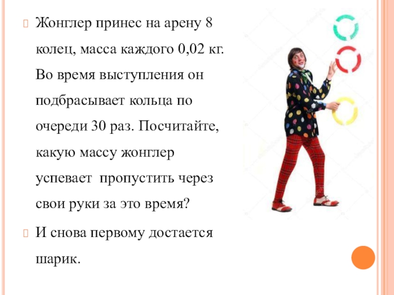 Слайд 10Жонглер принес на арену 8 колец, масса каждого 0,02 кг. Во