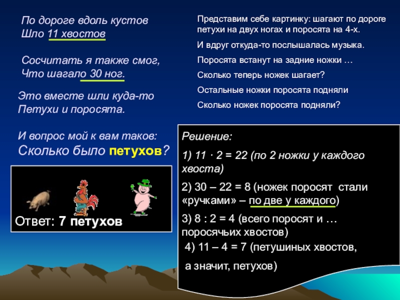 Представим себе картинку: шагают по дороге петухи на двух ногах и поросята на 4-х.