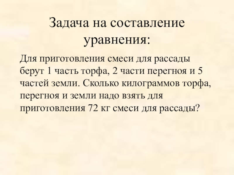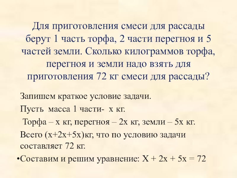 Торфа – х кг, перегноя – 2х кг, земли – 5х кг.
