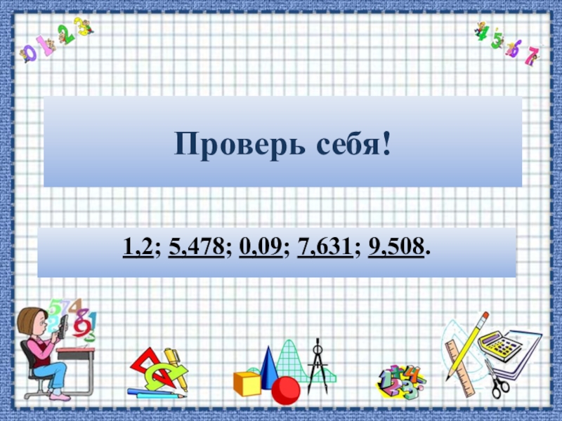 Проверь себя!1,2; 5,478; 0,09; 7,631; 9,508.