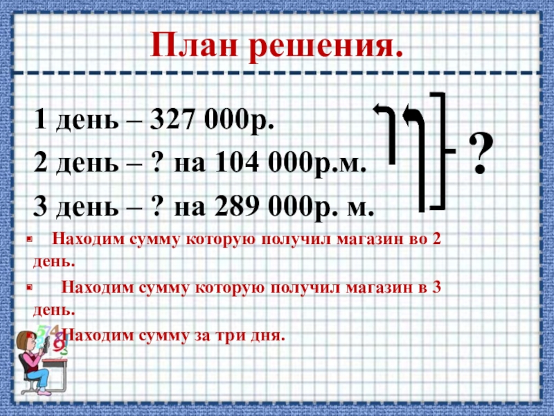 План решения.1 день – 327 000р.2 день – ? на 104 000р.м.