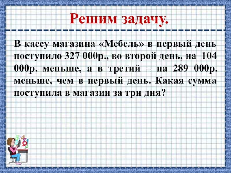 Решим задачу.В кассу магазина «Мебель» в первый день поступило 327 000р., во второй день, на 104 000р.
