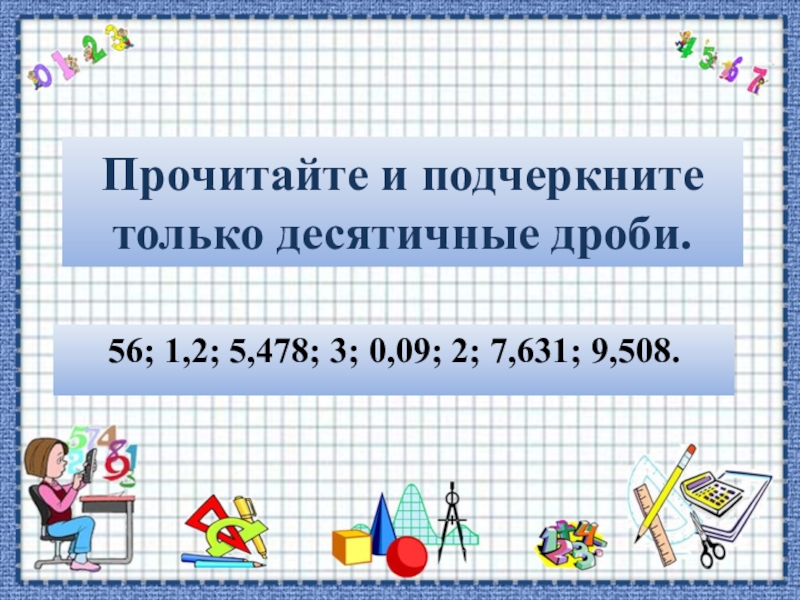 Прочитайте и подчеркните только десятичные дроби.56; 1,2; 5,478; 3; 0,09; 2; 7,631; 9,508.