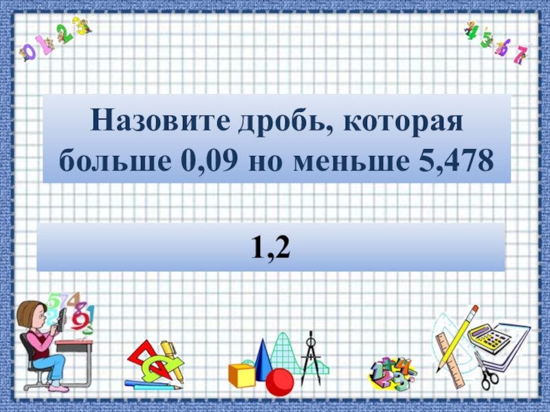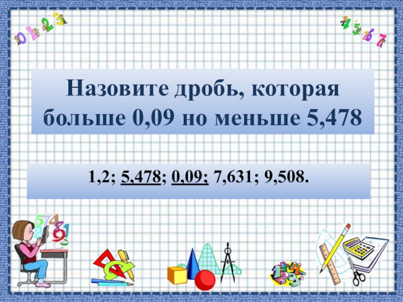 Слайд 4Назовите дробь, которая больше 0,09 но меньше 5,478