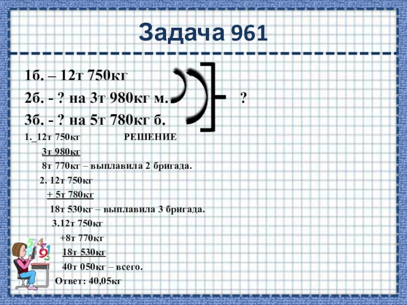 Задача 9611б. – 12т 750кг2б. - ? на 3т 980кг м.