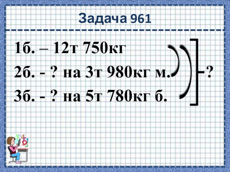 Задача 9611б. – 12т 750кг2б. - ? на 3т 980кг м.    ?3б. - ?