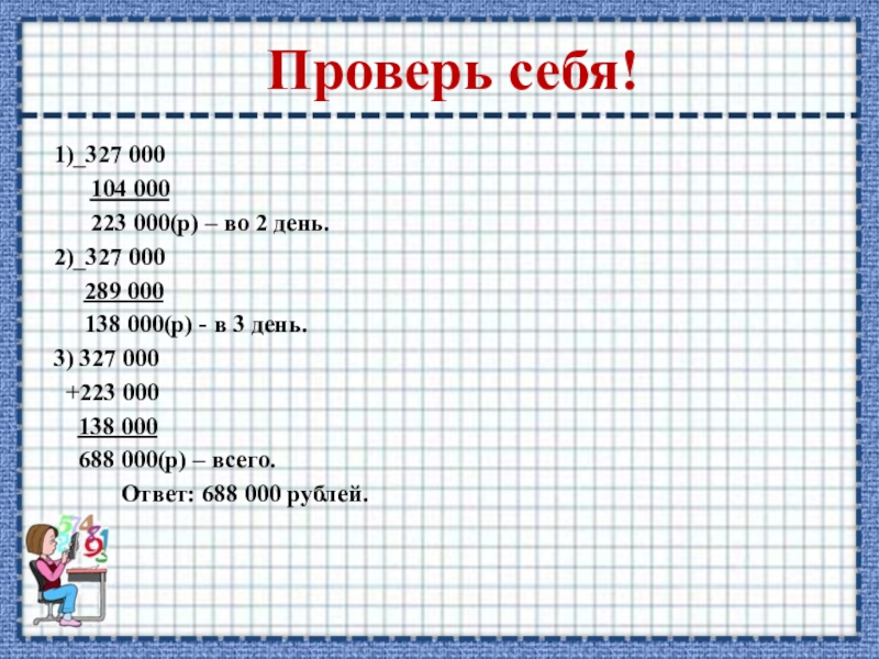 Проверь себя!1)_327 000   104 000   223 000(р) – во 2 день.2)_327 000