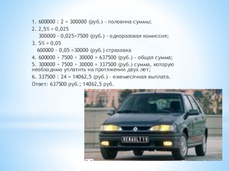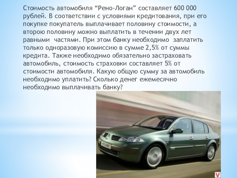 Слайд 10Стоимость автомобиля “Рено-Логан” составляет 600 000 рублей. В соответствии с условиями