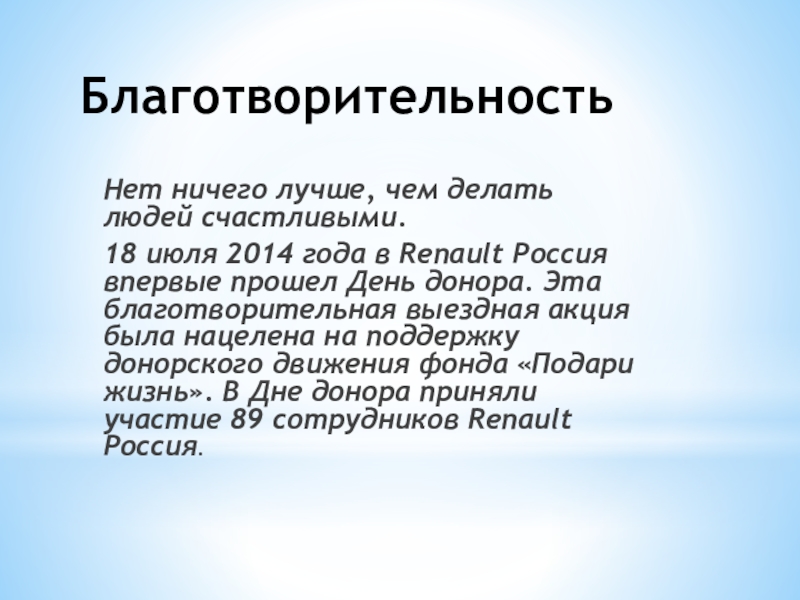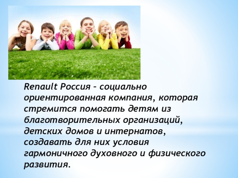 Слайд 15Renault Россия – социально ориентированная компания, которая стремится помогать детям из
