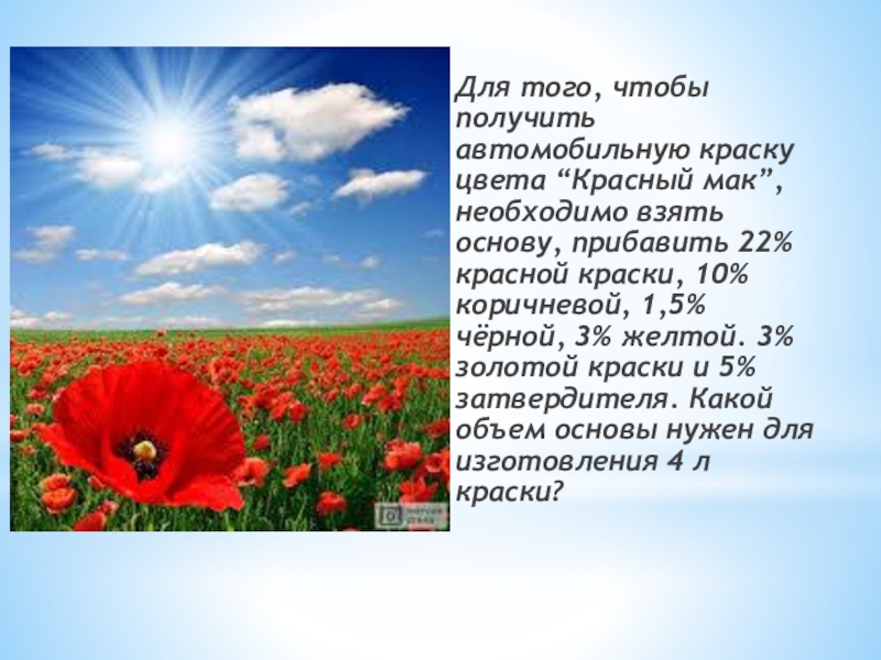 Для того, чтобы получить автомобильную краску цвета “Красный мак”, необходимо