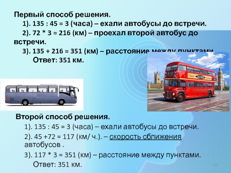 1). 135 : 45 = 3 (часа) – ехали автобусы до встречи.