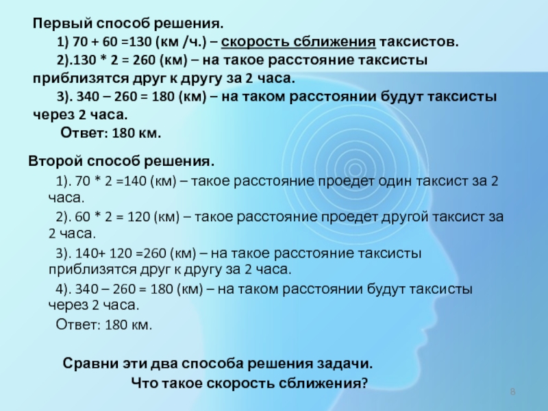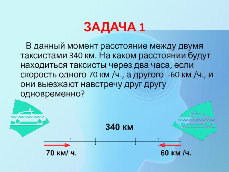 4). 340 – 260 = 180 (км) – на таком расстоянии будут таксисты через 2 часа.