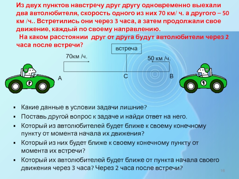 Который их автолюбителей будет ближе от пункта начала своего движения через 3 часа? Через 2 часа после встречи?