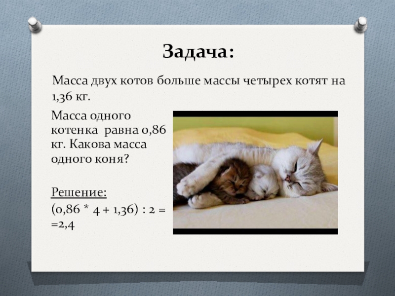 Масса двух котов больше массы четырех котят на 1,36 кг.