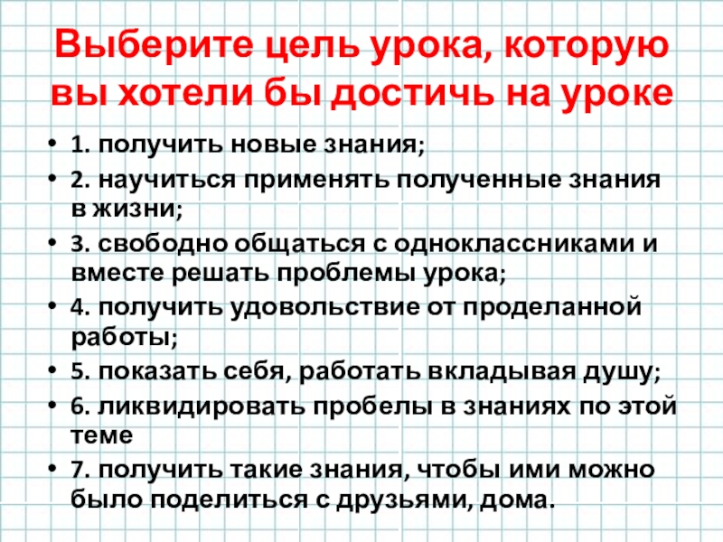 Слайд 5Выберите цель урока, которую вы хотели бы достичь на уроке