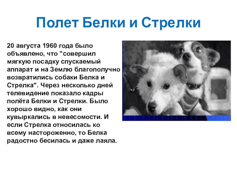мягкую посадку спускаемый аппарат и на Землю благополучно возвратились собаки Белка и Стрелка". Через несколько дней телевидение показало кадры полёта Белки и Стрелки. Было хорошо видно, как они кувыркались в невесомости. И если Стрелка относилась ко всему настороженно, то Белка радостно бесилась и даже лаяла.